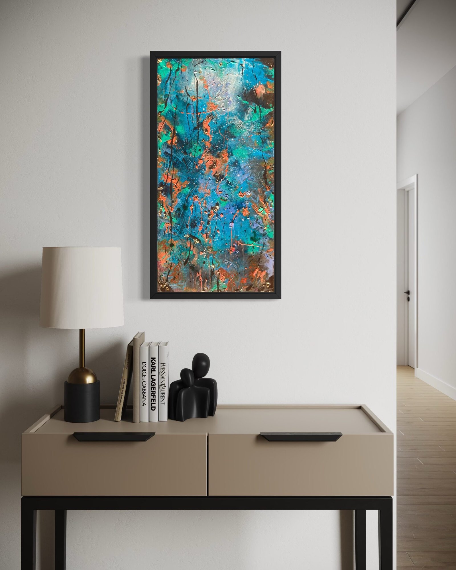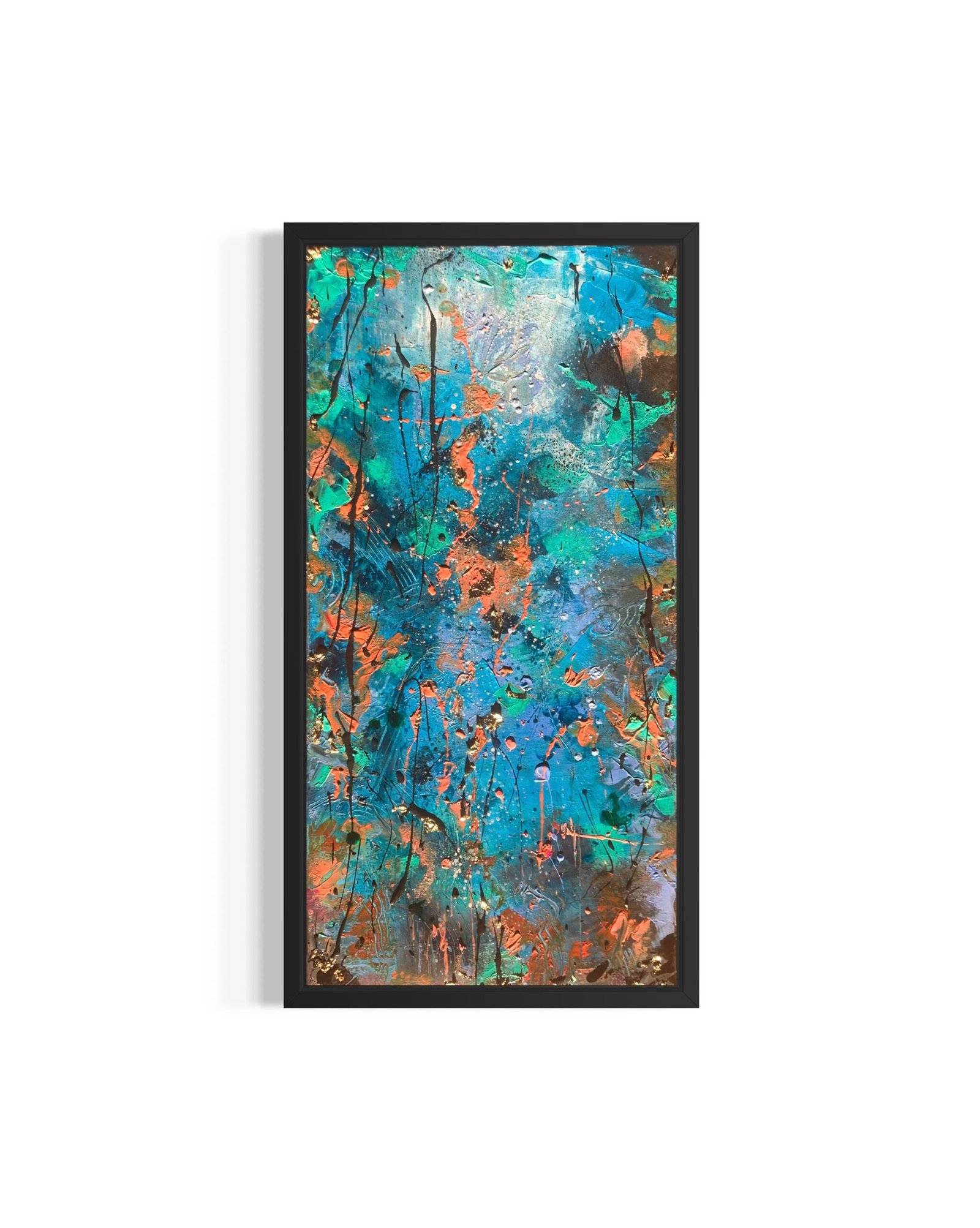 Le résultat est une explosion chromatique lumineuse, presque bioluminescente : une abstraction marine moderne qui pulse de vie, de mouvement et de lumière, comme si l’océan respirait sous vos yeux.