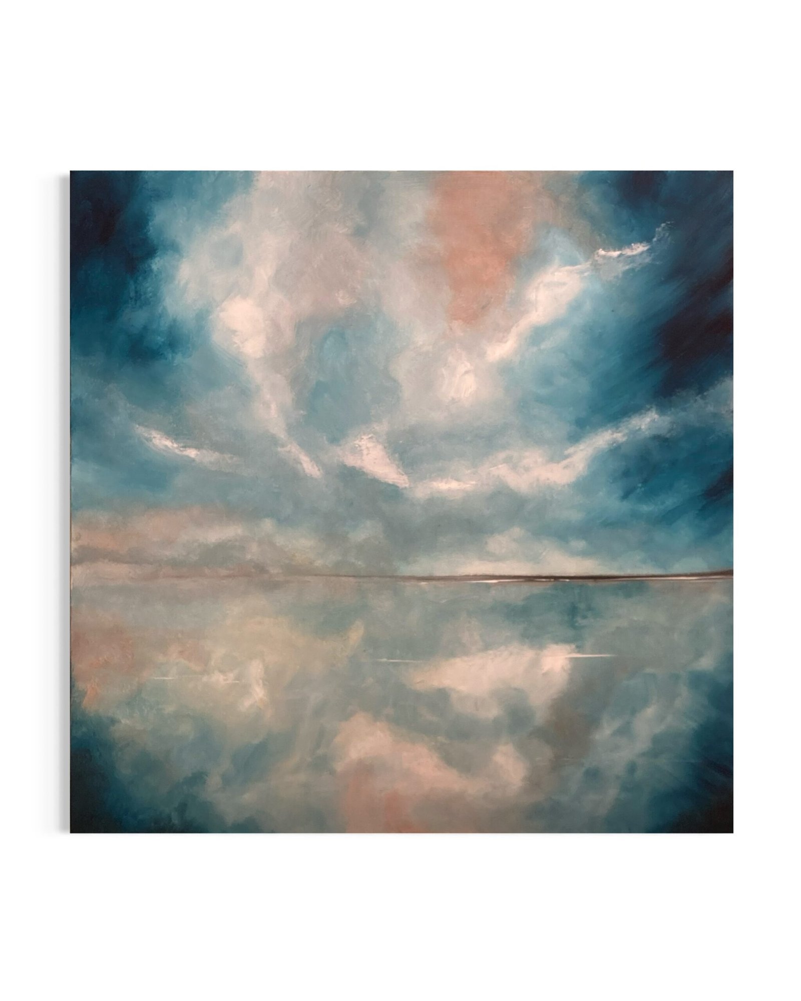 Les dégradés subtils, travaillés en blending à l’acrylique, créent une atmosphère enveloppante. Les nuances de bleus profonds, de gris lumineux et de tonalités plus chaudes semblent se fondre les unes dans les autres, effaçant les certitudes visuelles.