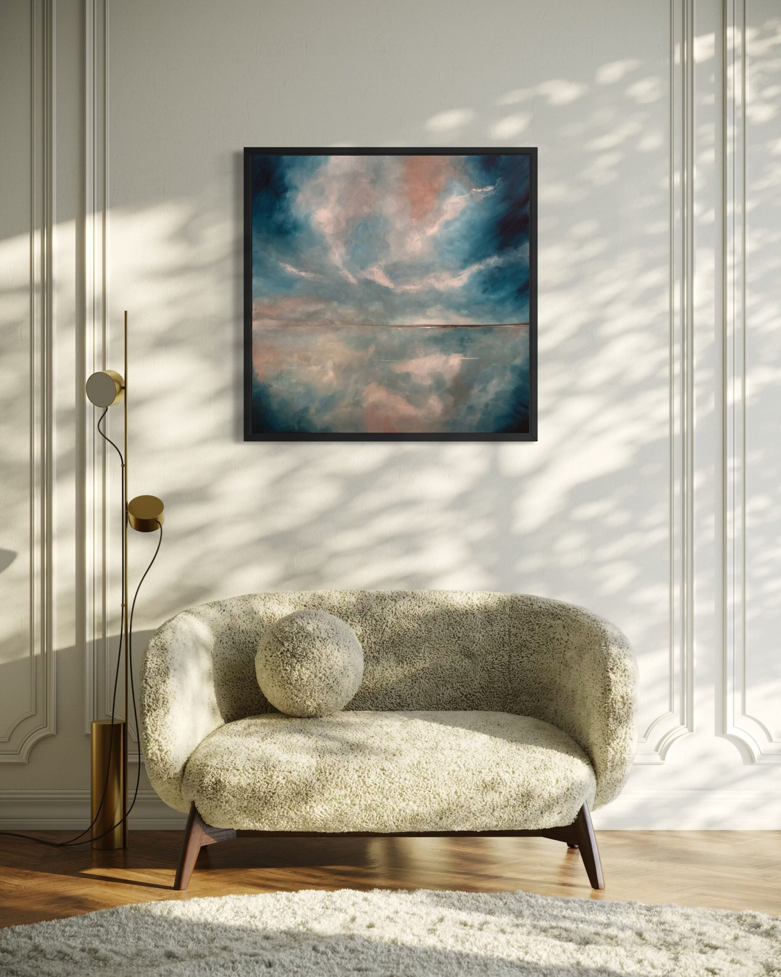 L’œuvre est particulièrement mise en valeur par un encadrement en caisse américaine noire, qui souligne la profondeur des teintes et accentue la ligne d’horizon centrale.