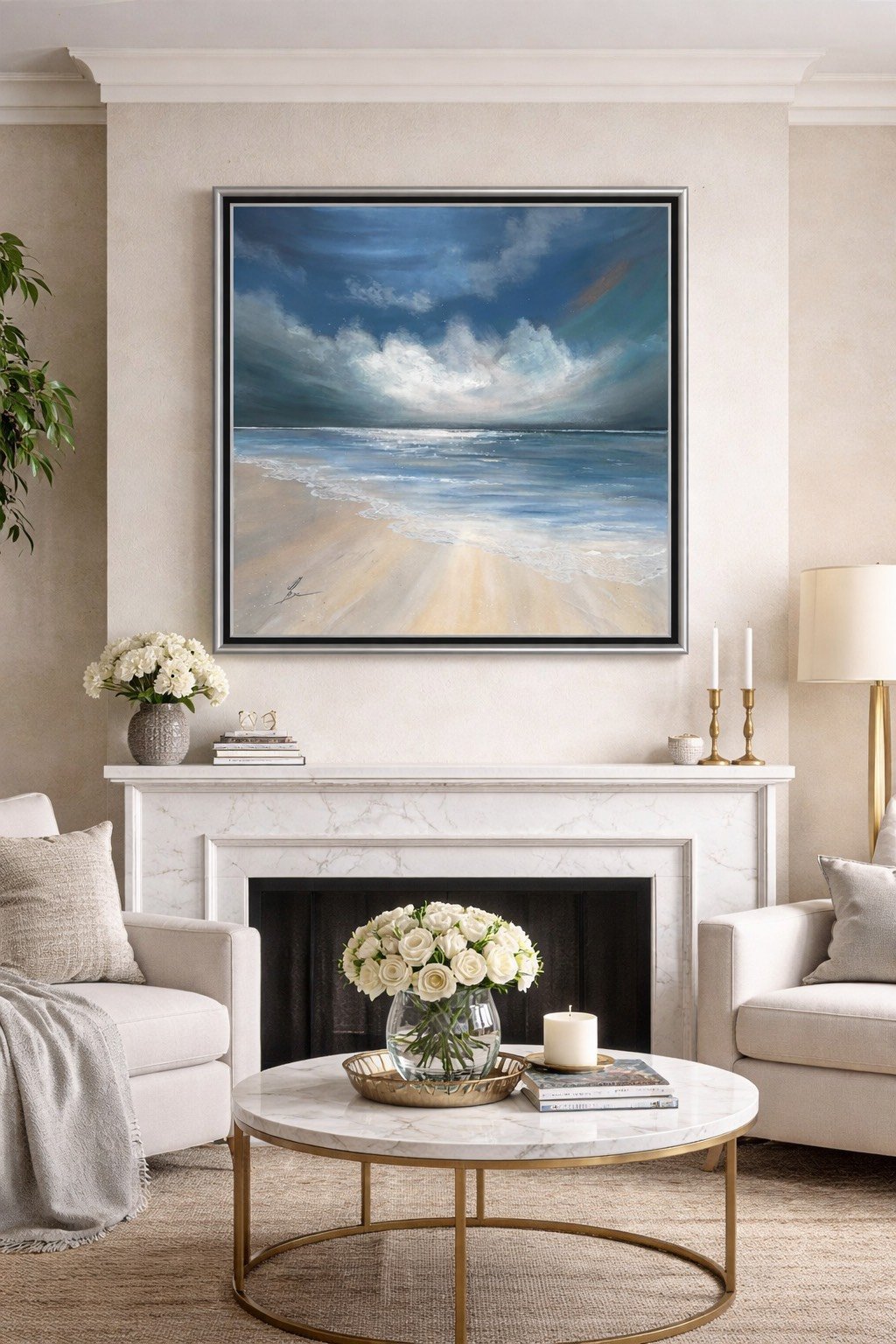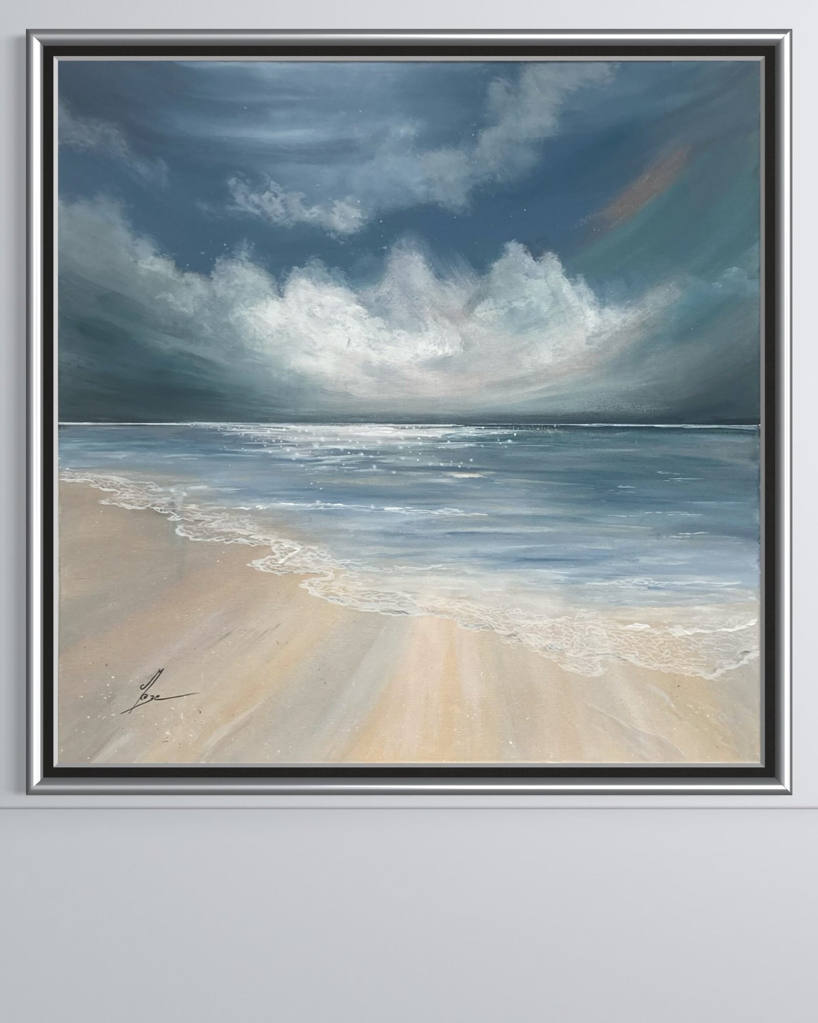 Cette œuvre invite à une pause profonde, un instant suspendu où le tumulte s’apaise. Un ciel chargé de nuages lourds laisse filtrer une lumière douce qui caresse une mer tranquille et un sable humide scintillant de mille reflets. La plage s’étend, infinie et sereine, comme un refuge où le temps ralentit et où l’esprit se pose enfin.