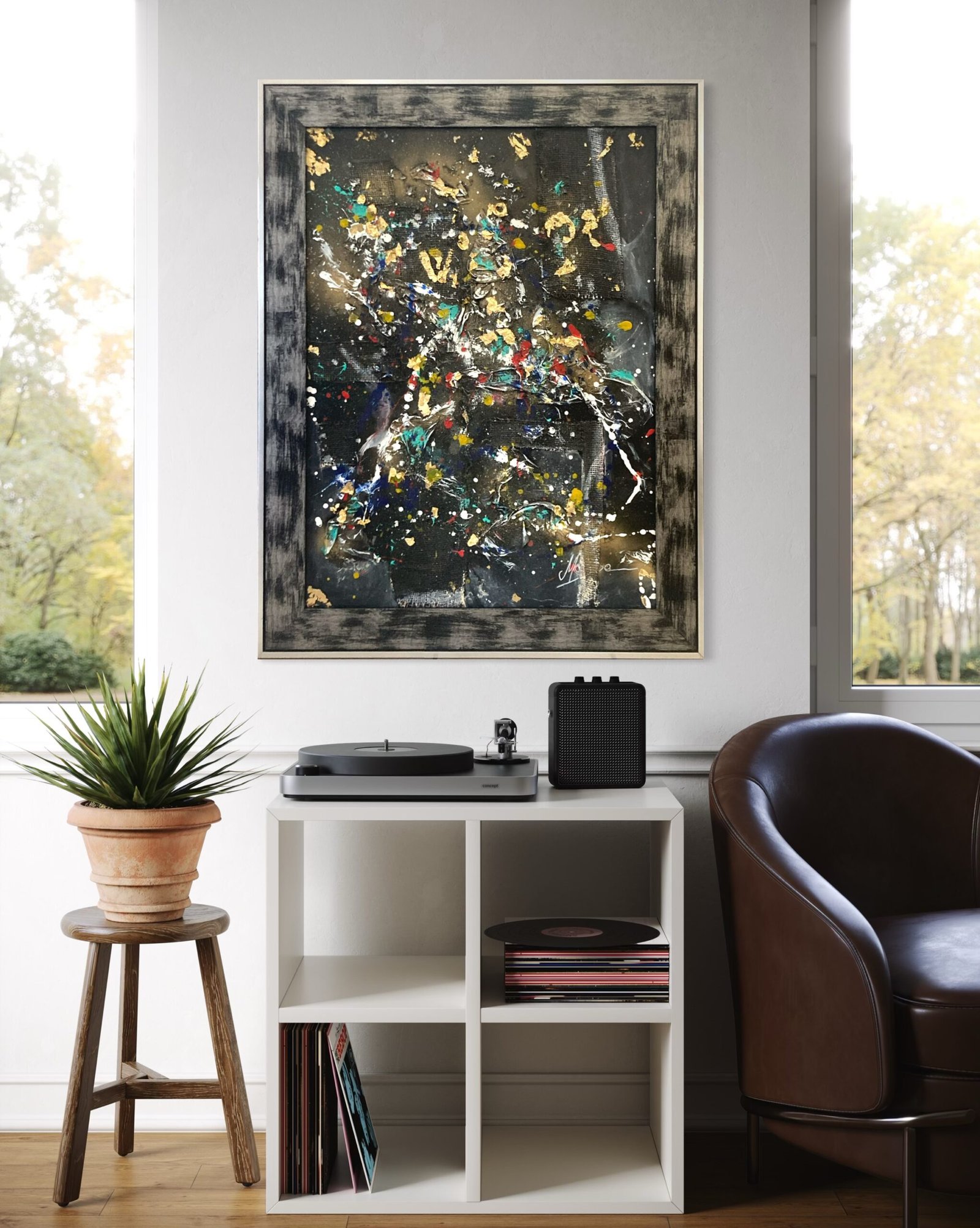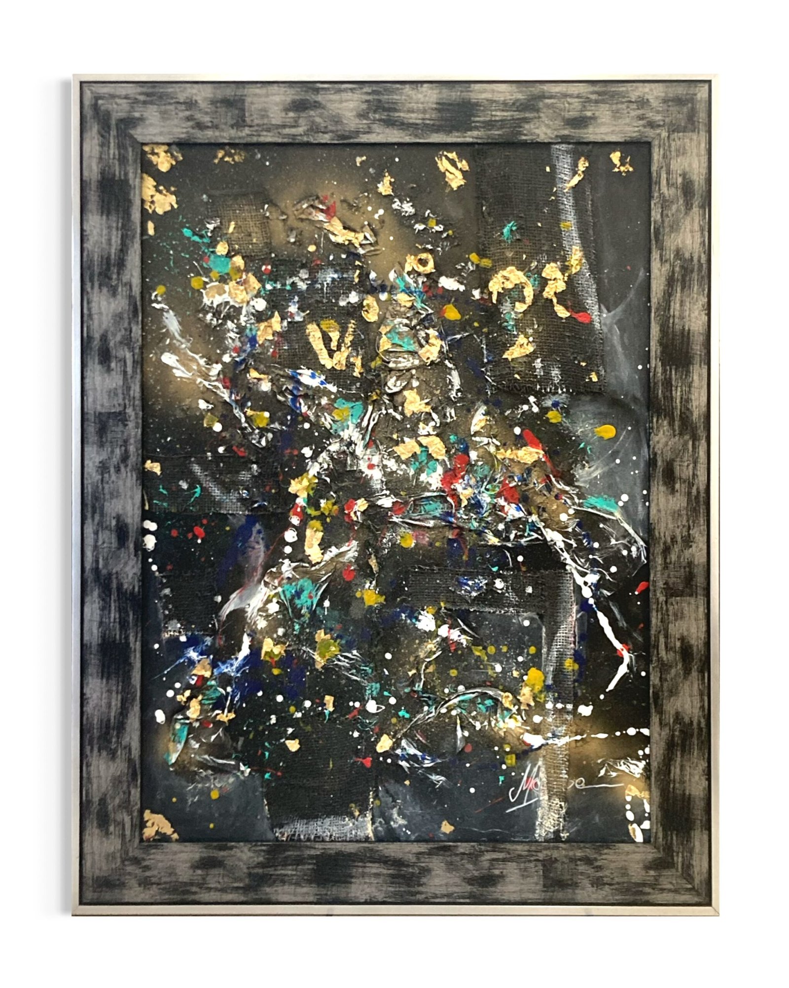 « Life » Peinture abstraite illustrant le déroulement de la vie de la plupart des gens. C’est à dire, pas comme un long fleuve tranquille … des idées qui mèneront à des victoires (illustrées par les feuilles dorées), des événements marquants et impossibles à oublier (représentés par les couleurs vives), des blessures qu’on doit panser (toile de jute à l’image des bandages), des pleurs et des joies ( mouchoirs en relief)… et le chemin à suivre pour se sentir bien. Lorsque l’on se dit que notre vie est parfois chaotique ou désorganisée, c’est peut être vrai sur le moment mais si on regarde tout ce qu’on a parcouru, on peut y voir un bel ensemble, singulier et unique. Œuvre disponible, idéale dans un intérieur contemporain pour une touche moderne, originale et texturée.