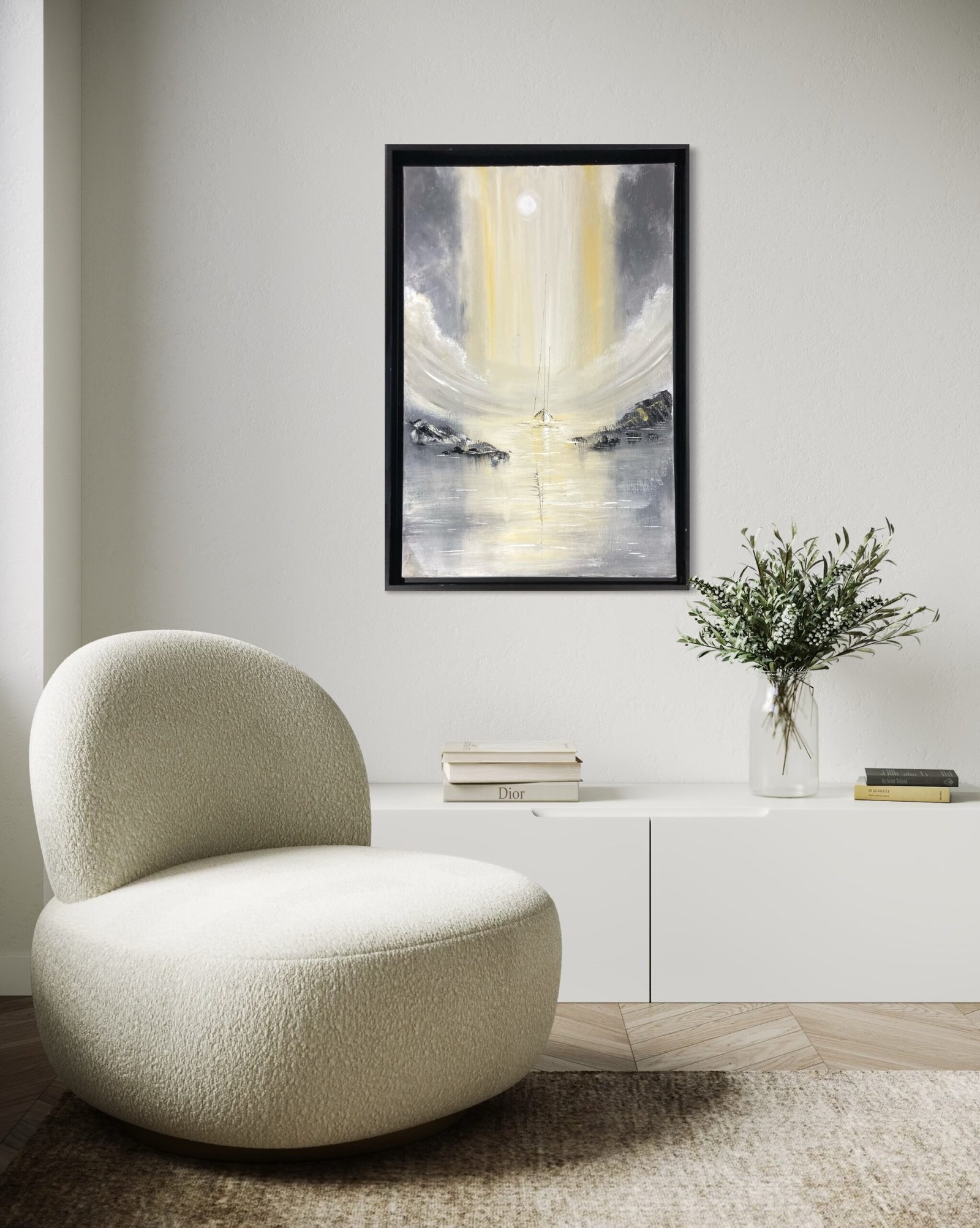Réalisée entièrement à l’acrylique au couteau, cette toile joue sur les superpositions de matière : les empâtements épais créent du relief et de la profondeur, tandis que les glacis transparents laissent passer la lumière et donnent cette sensation de halo mystique. Le contraste entre l’obscurité enveloppante et les touches lumineuses, évoque avec puissance le soulagement intense du marin qui aperçoit enfin son port après une longue absence.