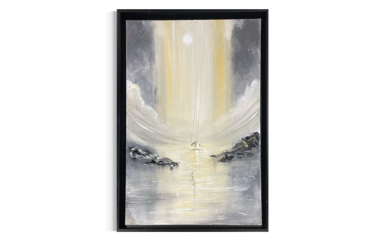 Au cœur de la nuit, un voilier solitaire glisse vers la lumière. Une lune pâle et presque surnaturelle éclaire le chemin, tandis que des rayons dorés percent les nuages comme une promesse de retour. Les eaux calmes reflètent cette lueur dans un miroir d’argent et d’or, encadrées par des falaises sombres et protectrices. L’atmosphère est à la fois atmosphérique et onirique, chargée d’une émotion profonde et silencieuse.