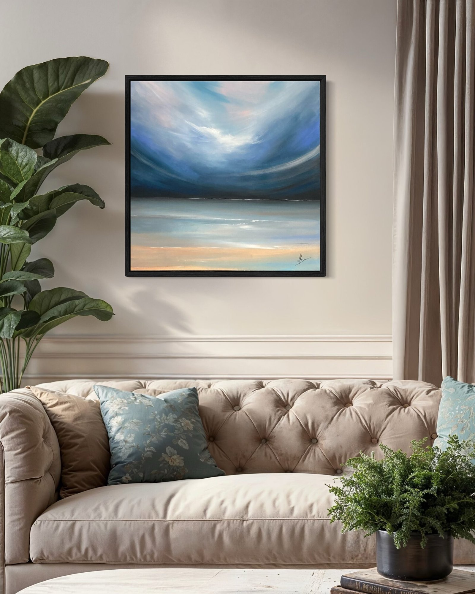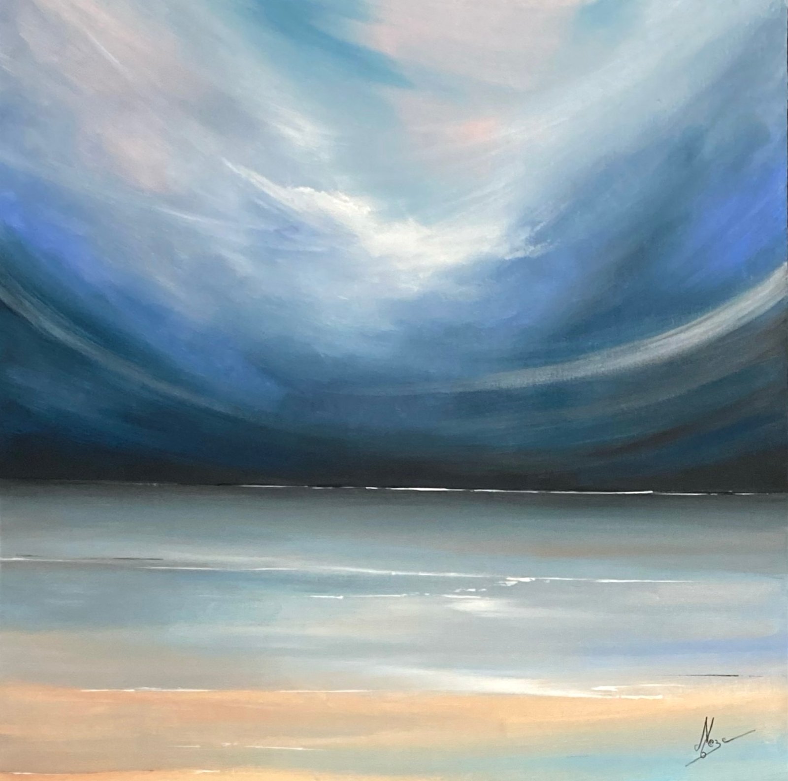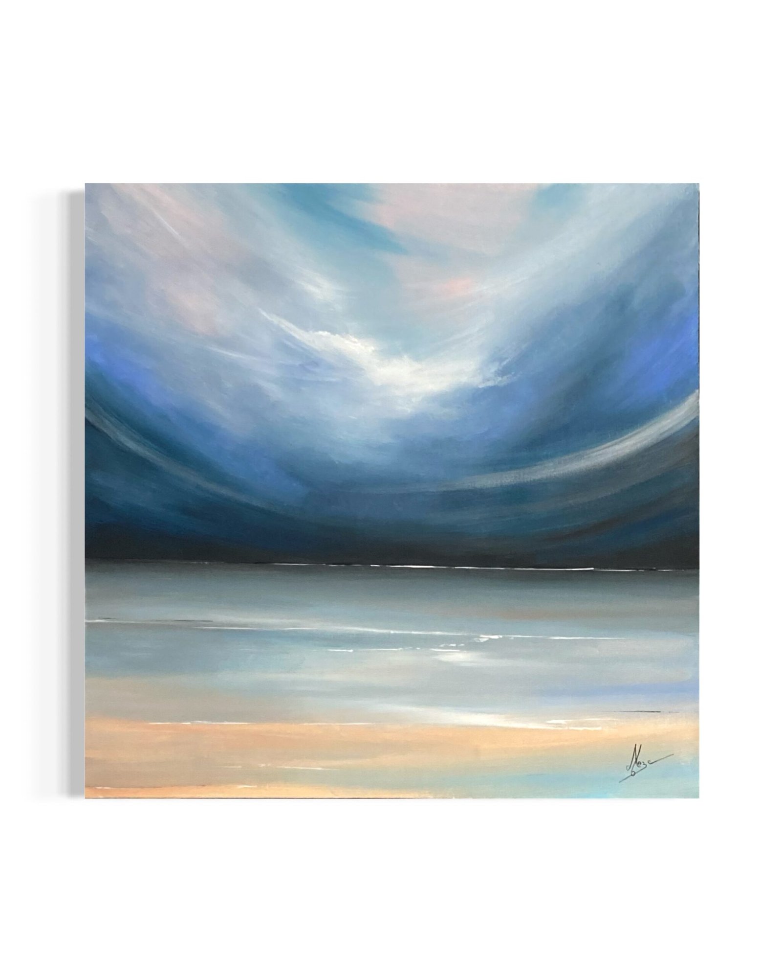 Cette toile carrée 80×80 cm capture un horizon courbé, presque enveloppant. Un ciel immense qui descend en voûte douce et protectrice. Des dégradés subtils de bleu profond, turquoise pastel et touches rosées-orangées. La mer se fait miroir calme, une ligne fine qui sépare à peine les deux éléments, créant une sensation d’unité absolue, de calme éternel et d’immensité apaisante.